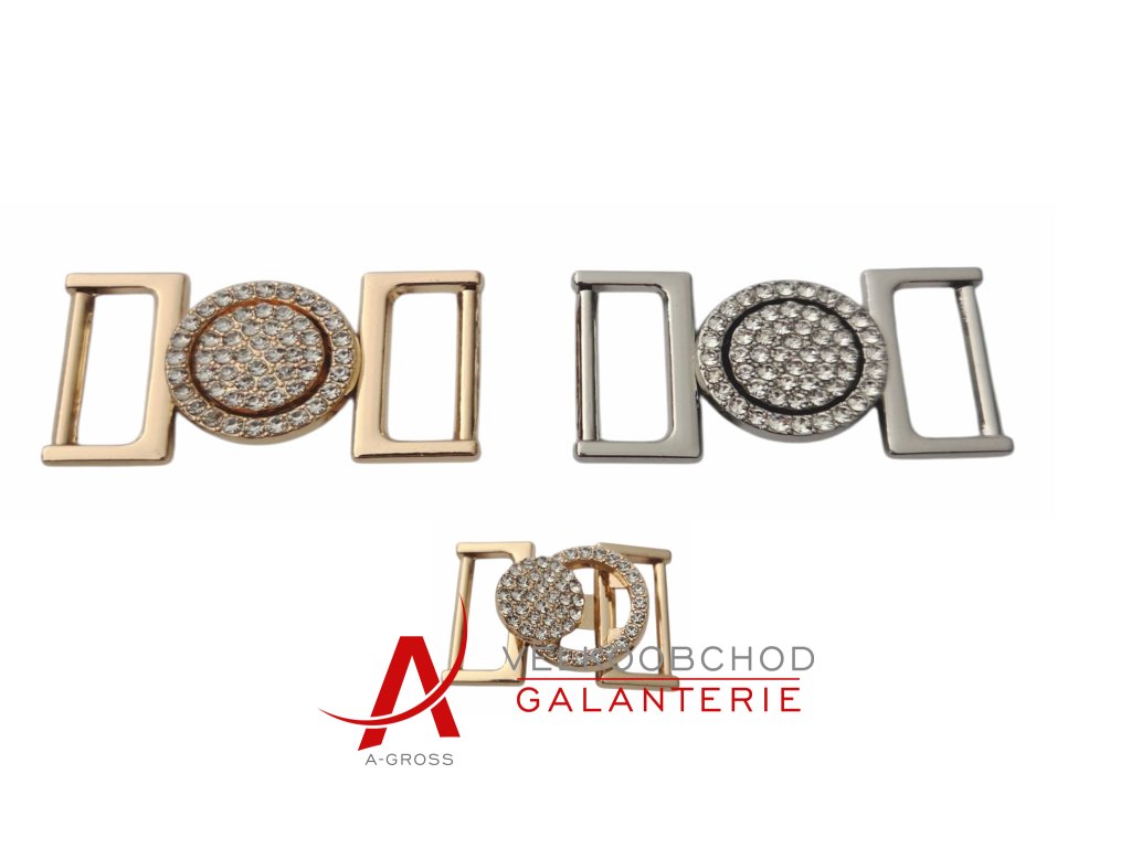 Dvoudílné zapínání s kamínky, průvlek 18 mm, délka 44 mm, šířka 24 mm. Balení 1 kus.