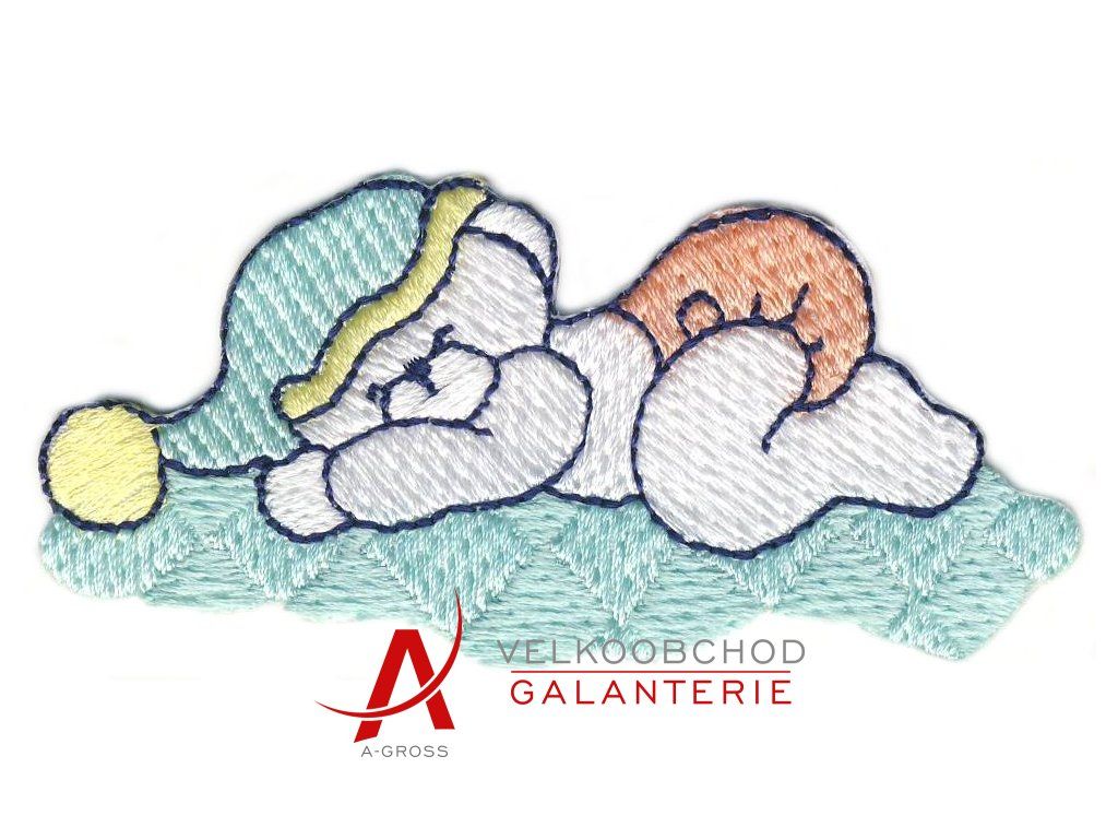 Dodejte oblečení vašich nejmenších nádech něžnosti s touto propracovanou nažehlovačkou. Motiv zobrazuje spícího bílého medvídka v tyrkysovo-zelené čepičce na spaní, který odpočívá na tyrkysovém obláčku vedle oranžového půlměsíce. Celý obrázek je tvořen hustou saténovou výšivkou se zpevněným obšitím po obvodu, což zabraňuje třepení a zaručuje vysokou odolnost.